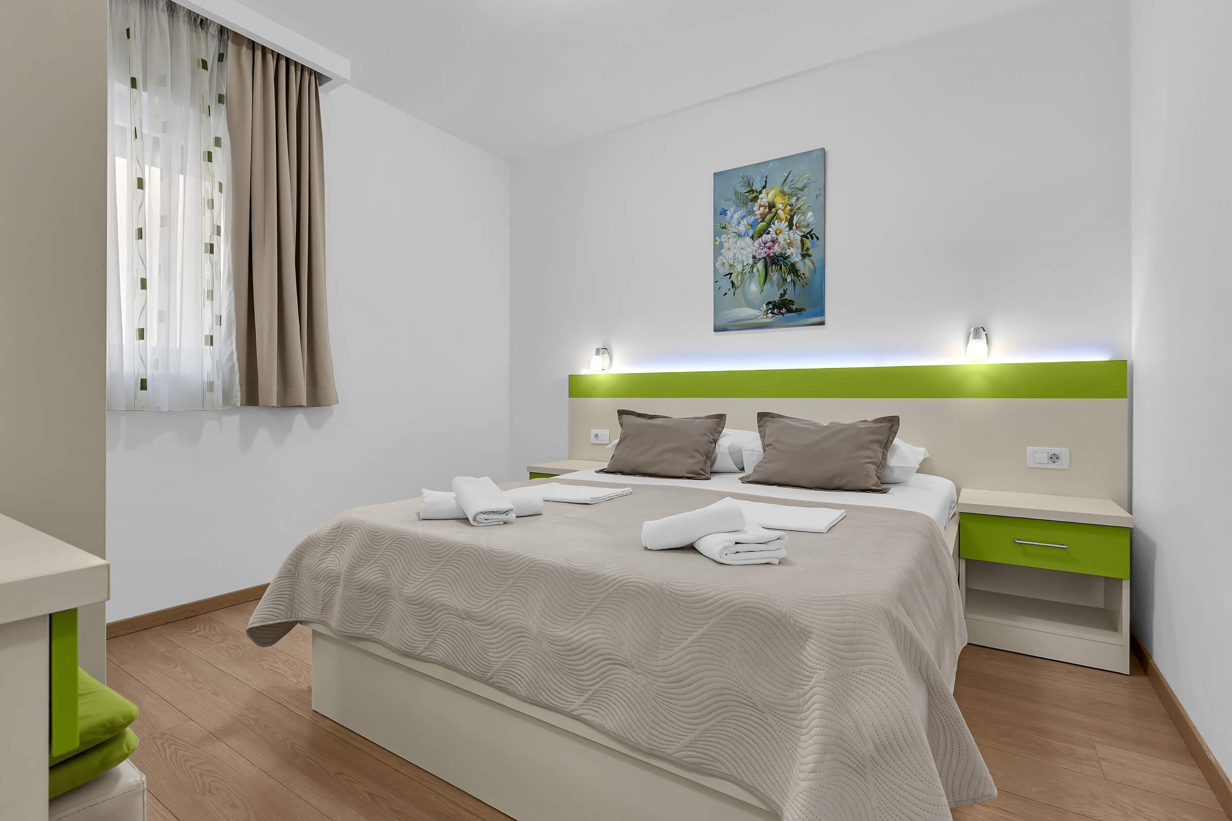 Svaki apartman ima zasebnu spavaću sobu s bračnim krevetom, prostranu kupaonicu s velikim tušem, potpuno opremljenu kuhinju, blagovaonicu i dnevni boravak s klima uređajem (hlađenje i grijanje). U dnevnom boravku nalazi se udoban kauč na razvlačenje za dvije odrasle osobe ili djecu, te neograničen Wi-Fi. Iz dnevnog boravka izlazi se na veliki balkon (9 m²).