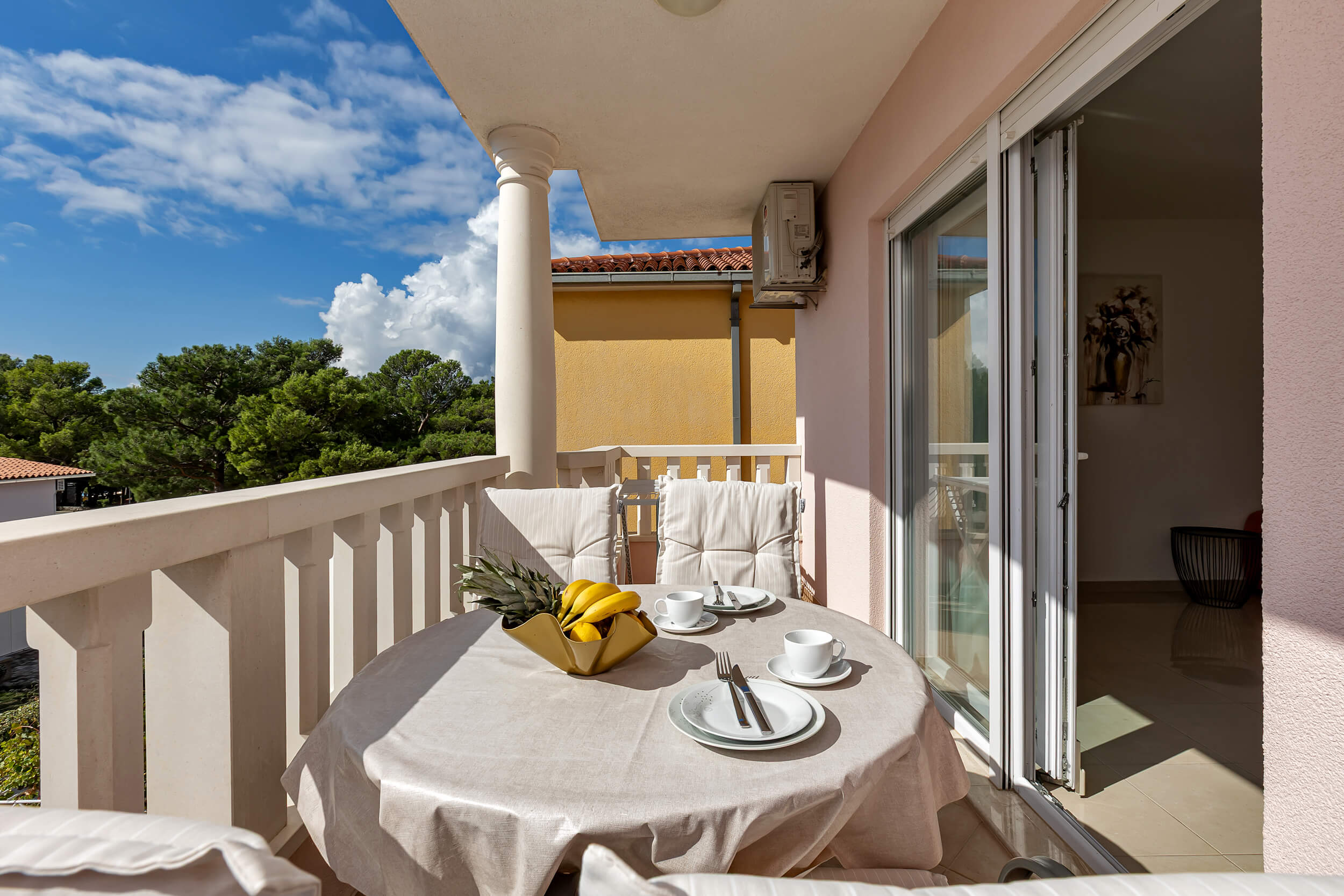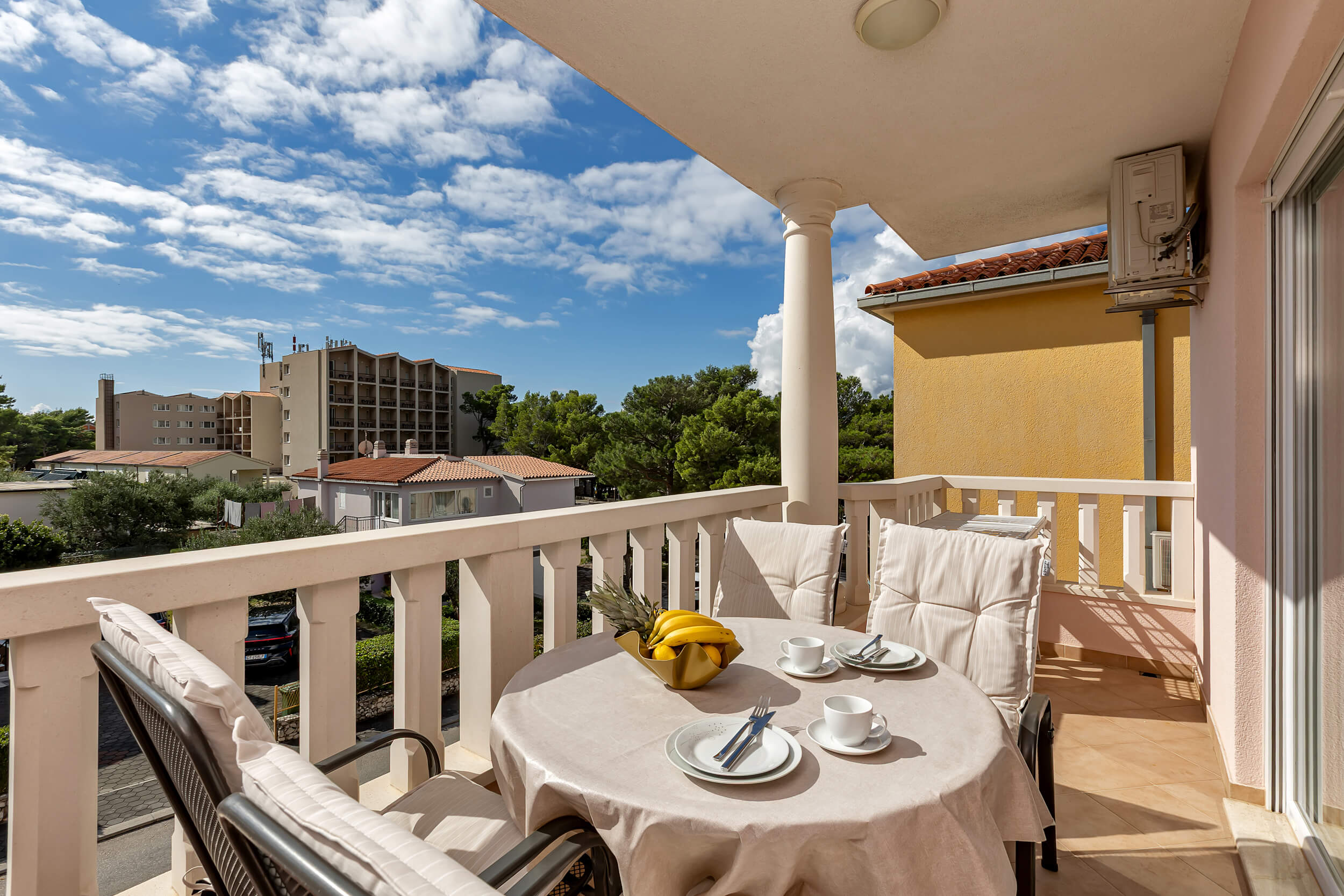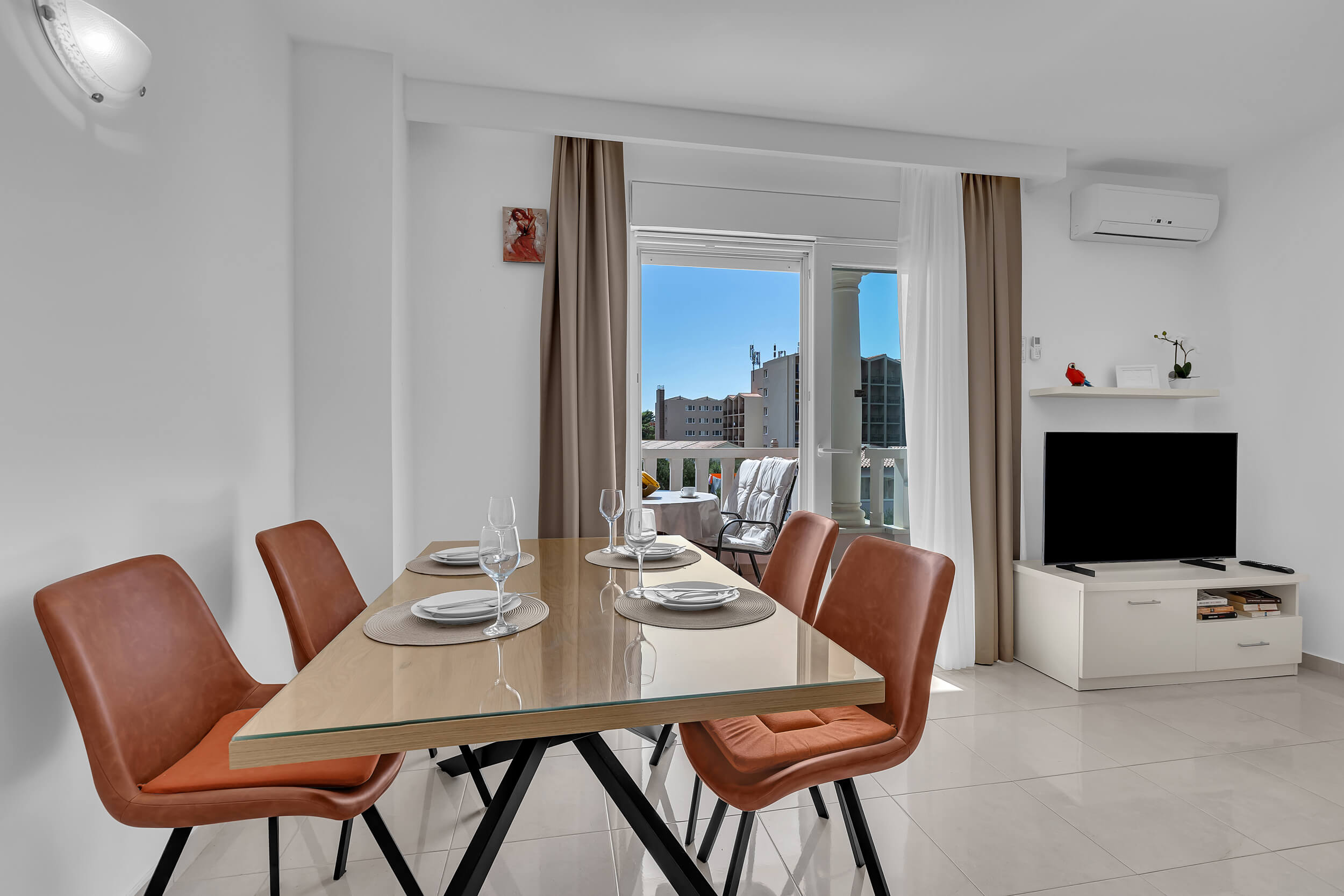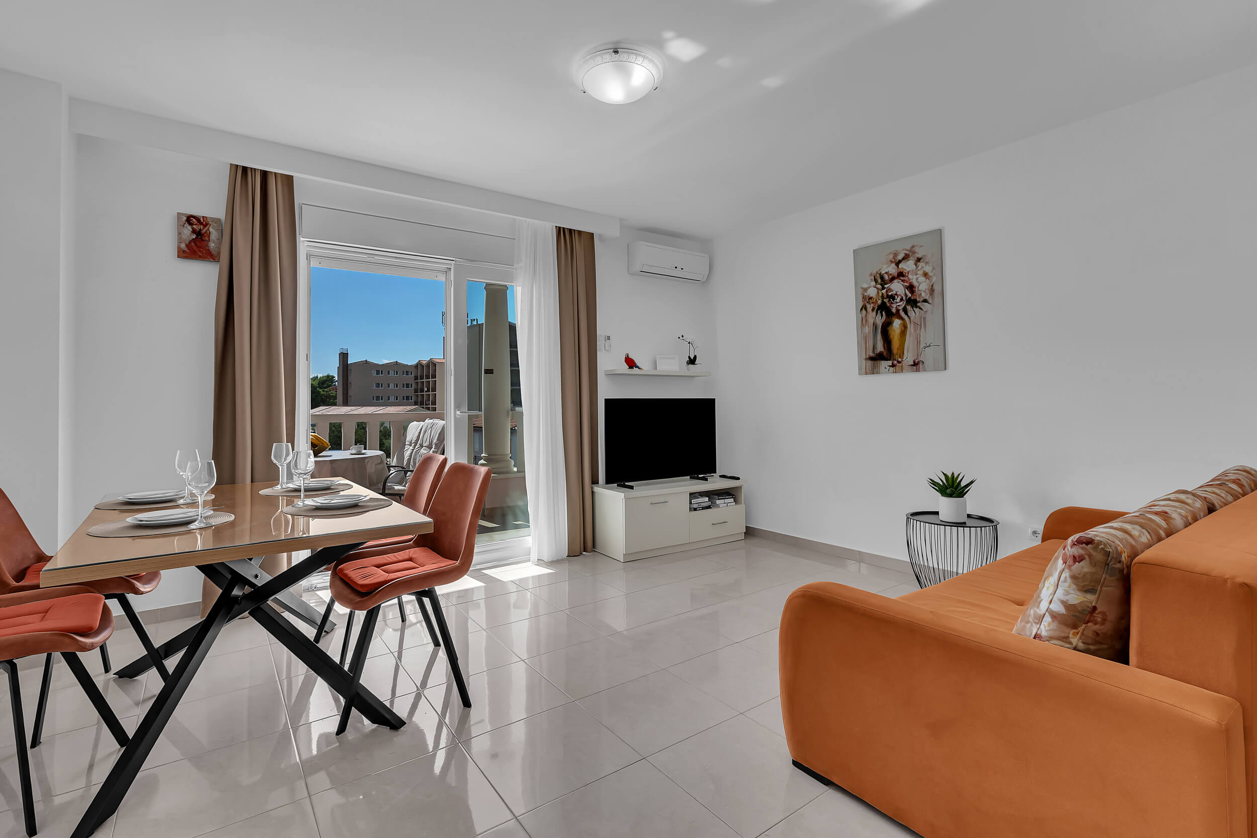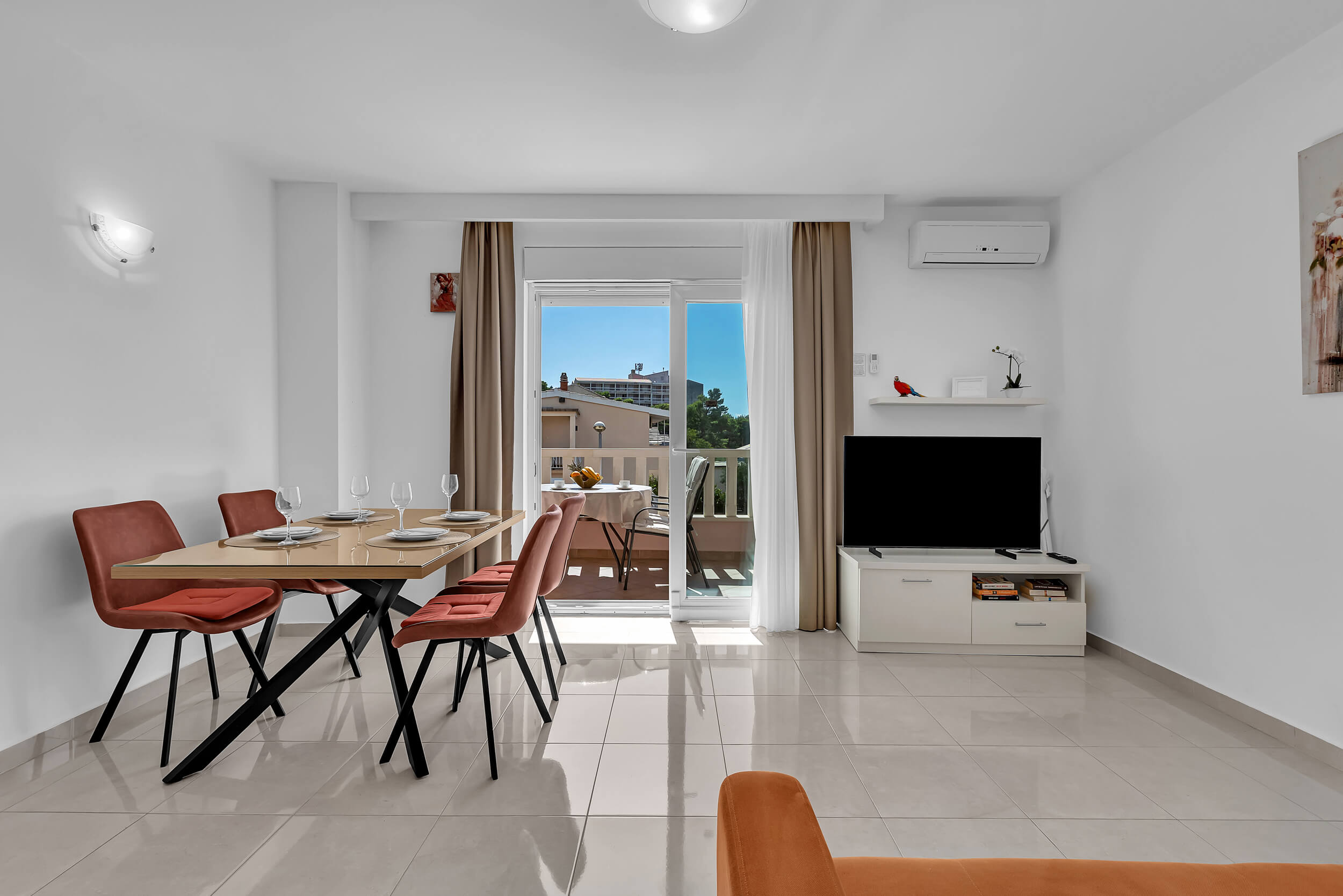 Apartment A3 *** – located on the first floor. It consists of one bedroom with a double bed. The living room features a sofa bed that can comfortably accommodate two older children. In addition to the bedroom and the living room, the apartment offers a modern, fully equipped kitchen (dishwasher, etc.), a dining area, a fully equipped bathroom, and a large 9 m² balcony.
